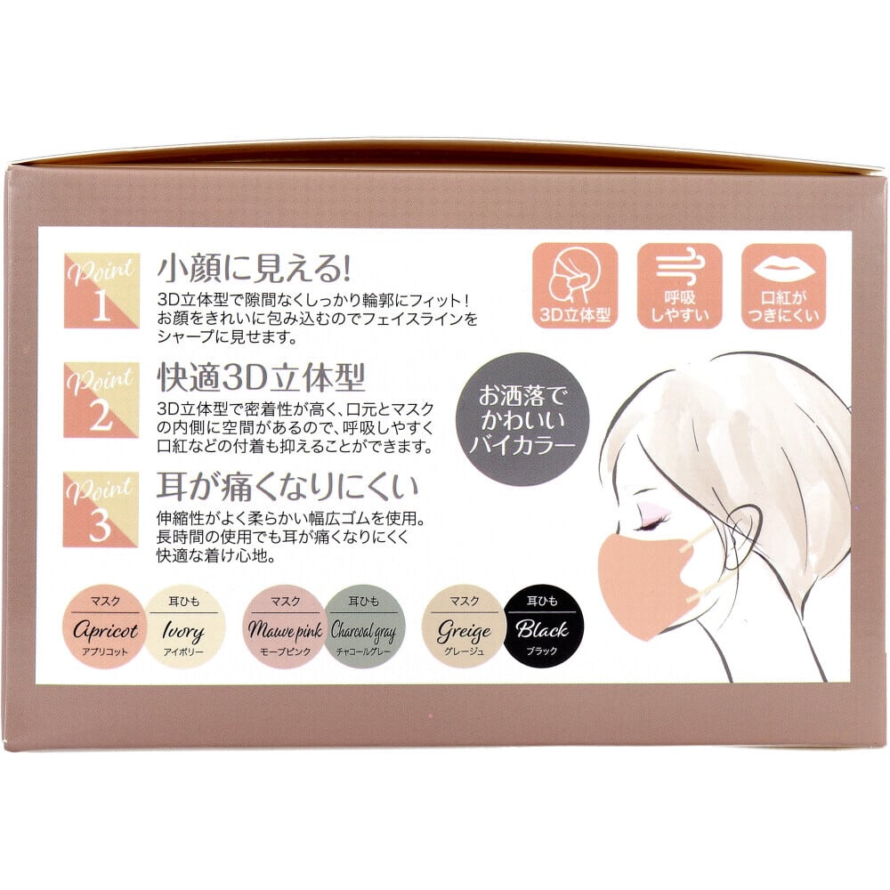 3D立体型で密着性が高く、口元とマスクの内側に空間があるので、 呼吸しやすく口紅などの付着も抑えることができます。