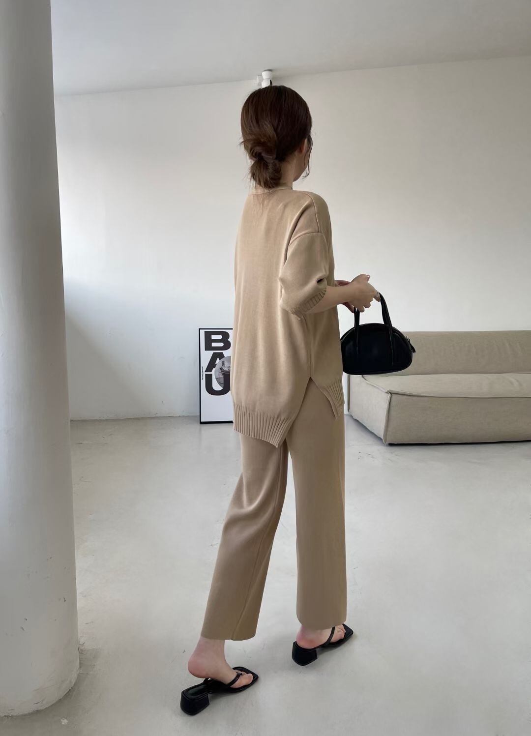 2022春夏新作 2点セットアップ Vネック 半袖 着回し カジュアル トップス ワイドパンツ