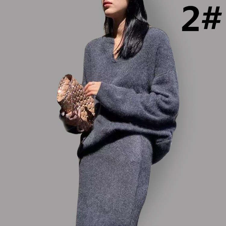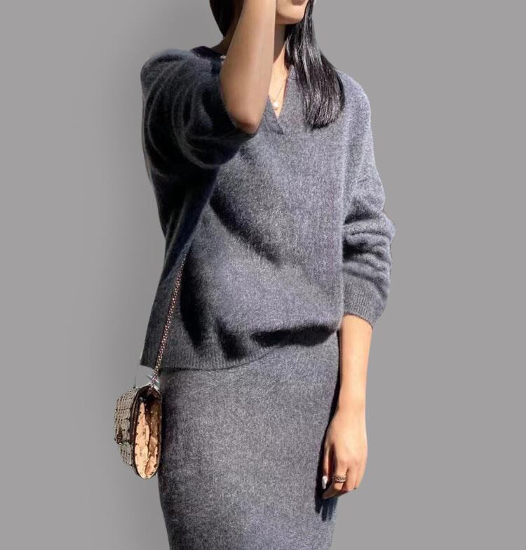 Vネック トップス 韓国 ニットセーター 長袖 2点セット 体型カバー エレガント ニットスカート 厚手
